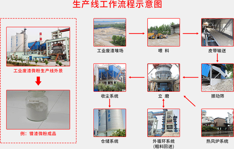 【工藝流程】堆放著的工業(yè)廢渣由鏟車取料、喂料,通過皮帶機進(jìn)行輸送。在輸送過程中,工業(yè)廢渣原料先后經(jīng)由除鐵器和振動篩得到除鐵和篩分,然后通過稱重設(shè)備倉、提升機進(jìn)入立磨機進(jìn)行粉磨。粉磨后的工業(yè)廢渣借助熱風(fēng)爐提供的熱風(fēng),通過選粉機進(jìn)行選粉,同時得到烘干。符合細(xì)度要求的工業(yè)廢渣微粉最后被輸送到收塵器收集、盛放后,由空氣輸送斜槽、提升機進(jìn)入成品庫中儲存。