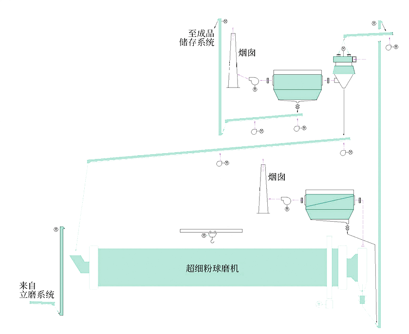 01來(lái)自立磨系統(tǒng)的物料粉,由提升機(jī)輸送至超細(xì)球磨機(jī)內(nèi)進(jìn)行粉磨,超細(xì)球磨機(jī)出口處配有收塵器對(duì)揚(yáng)塵處收塵;